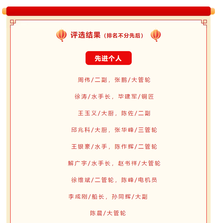 艱辛的一年就要過(guò)去了,為表彰先進(jìn),樹立典型,弘揚(yáng)進(jìn)取精神,充分調(diào)動(dòng)廣大船員的積極性、主動(dòng)性和創(chuàng)新性,進(jìn)一步激勵(lì)工作在一線船員的工作熱情,形成“船船爭(zhēng)先進(jìn)、人人比貢獻(xiàn)”的良好氛圍。經(jīng)研究決定,對(duì)本年度內(nèi)公司所有派員船舶及所派船員進(jìn)行評(píng)比考核,結(jié)合船東對(duì)各輪的考核,評(píng)選出新的“先進(jìn)船舶”、“先進(jìn)個(gè)人”及“總經(jīng)理特別獎(jiǎng)”,并給予一定的物質(zhì)獎(jiǎng)勵(lì)。